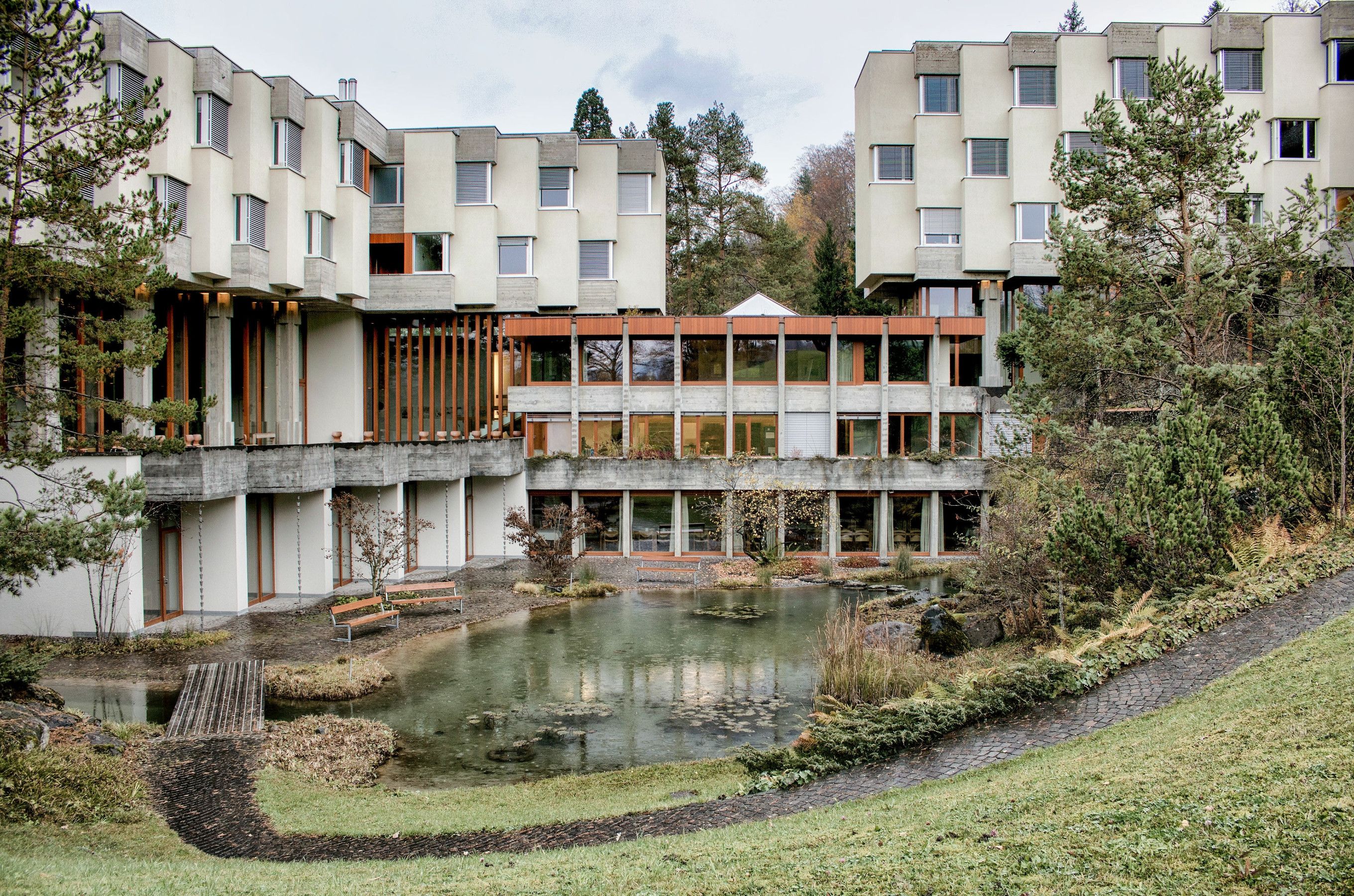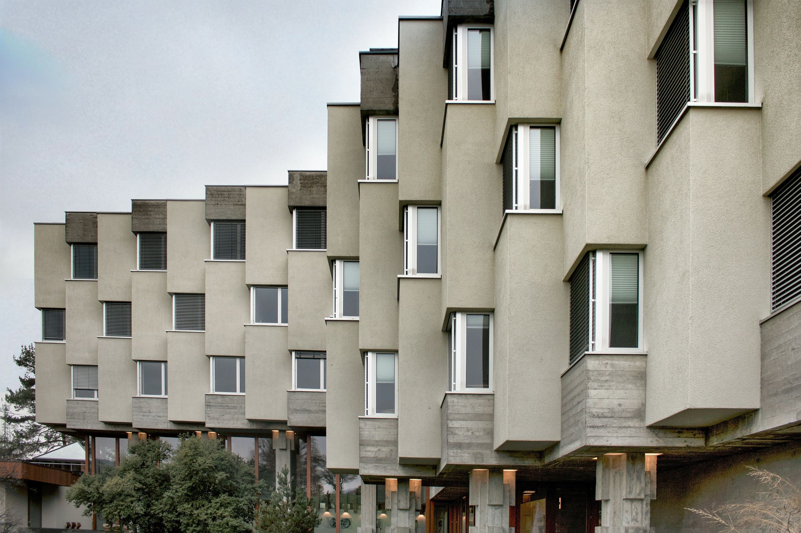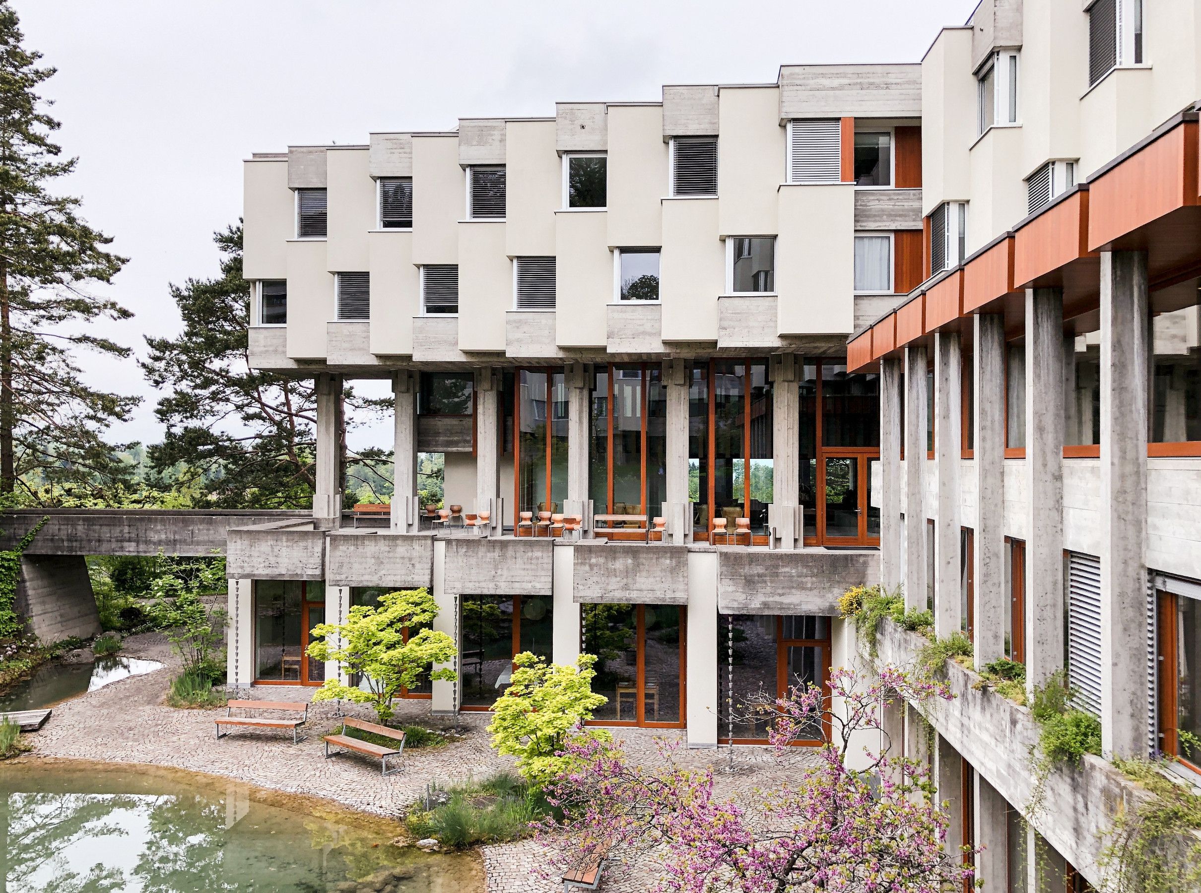 The brutalist building, constructed between 1968 and 1970, was designed by Zurich architect André Studer, who composed the complex according to the principles of “harmonic construction.” Landscape architect Josef Seleger created the perfect connection to nature.