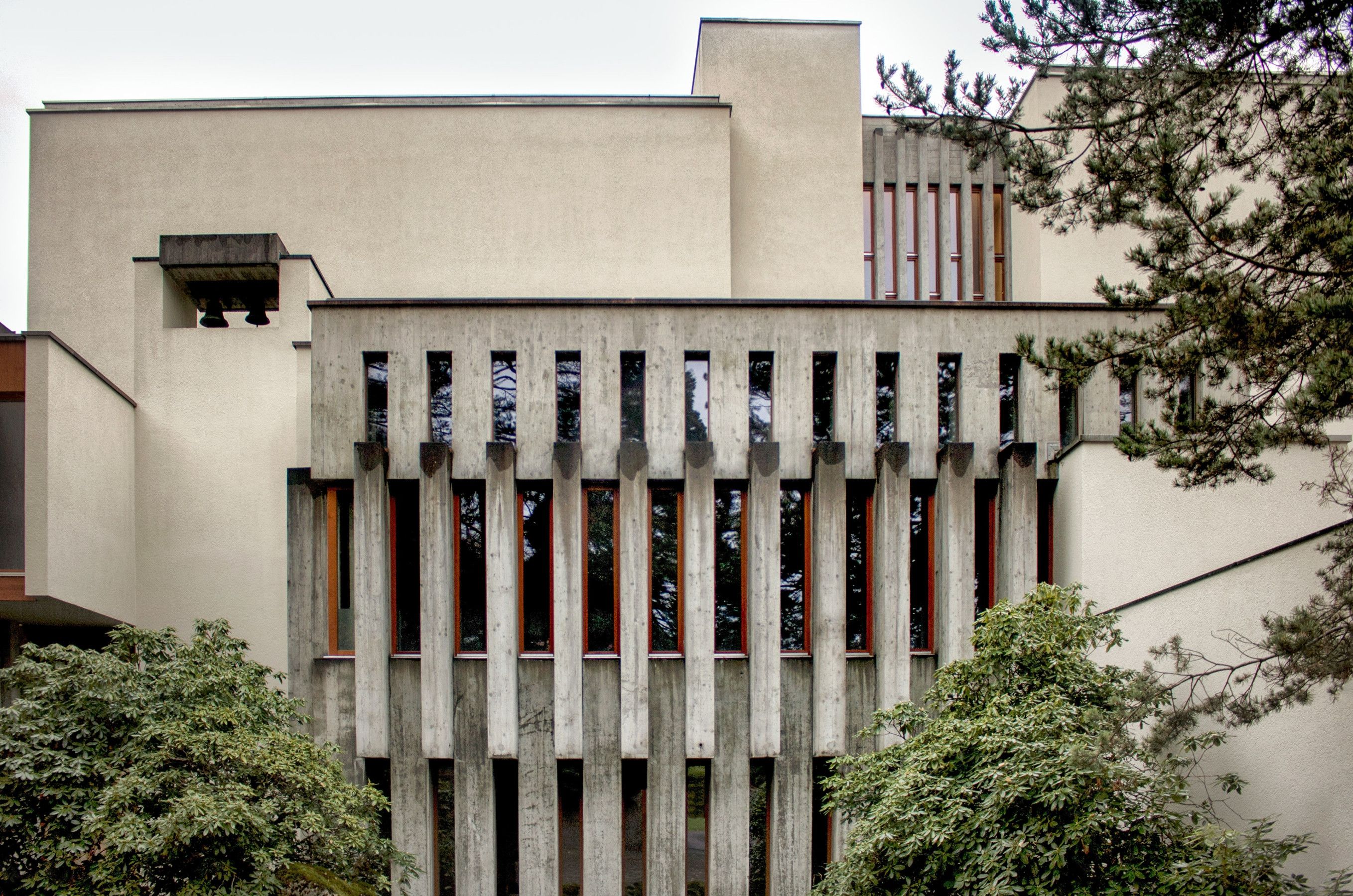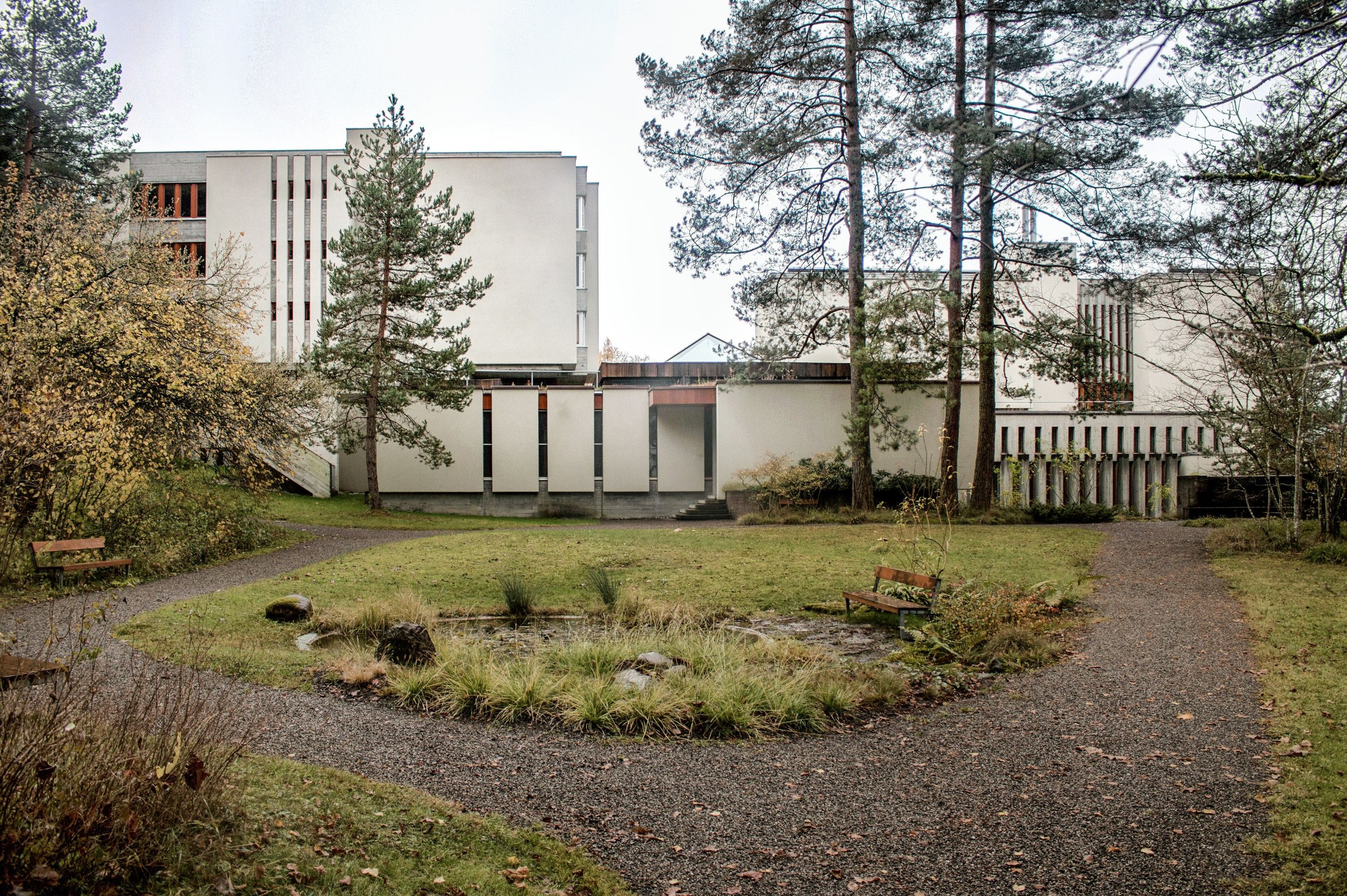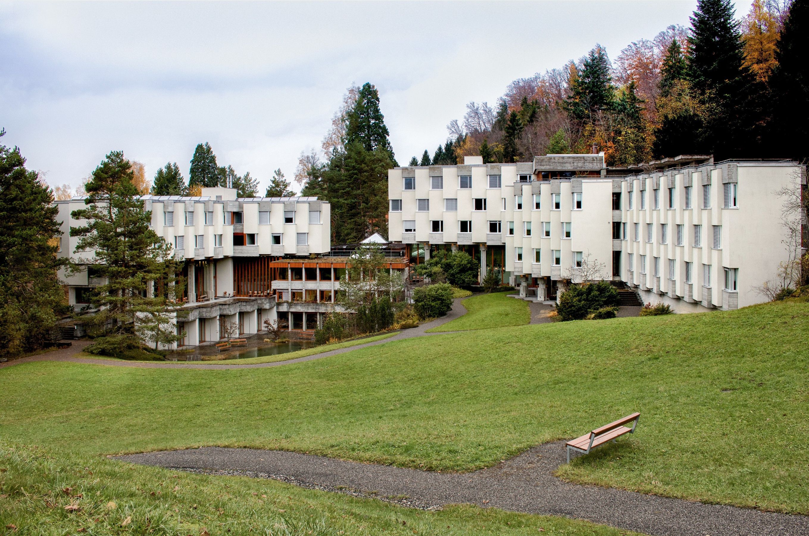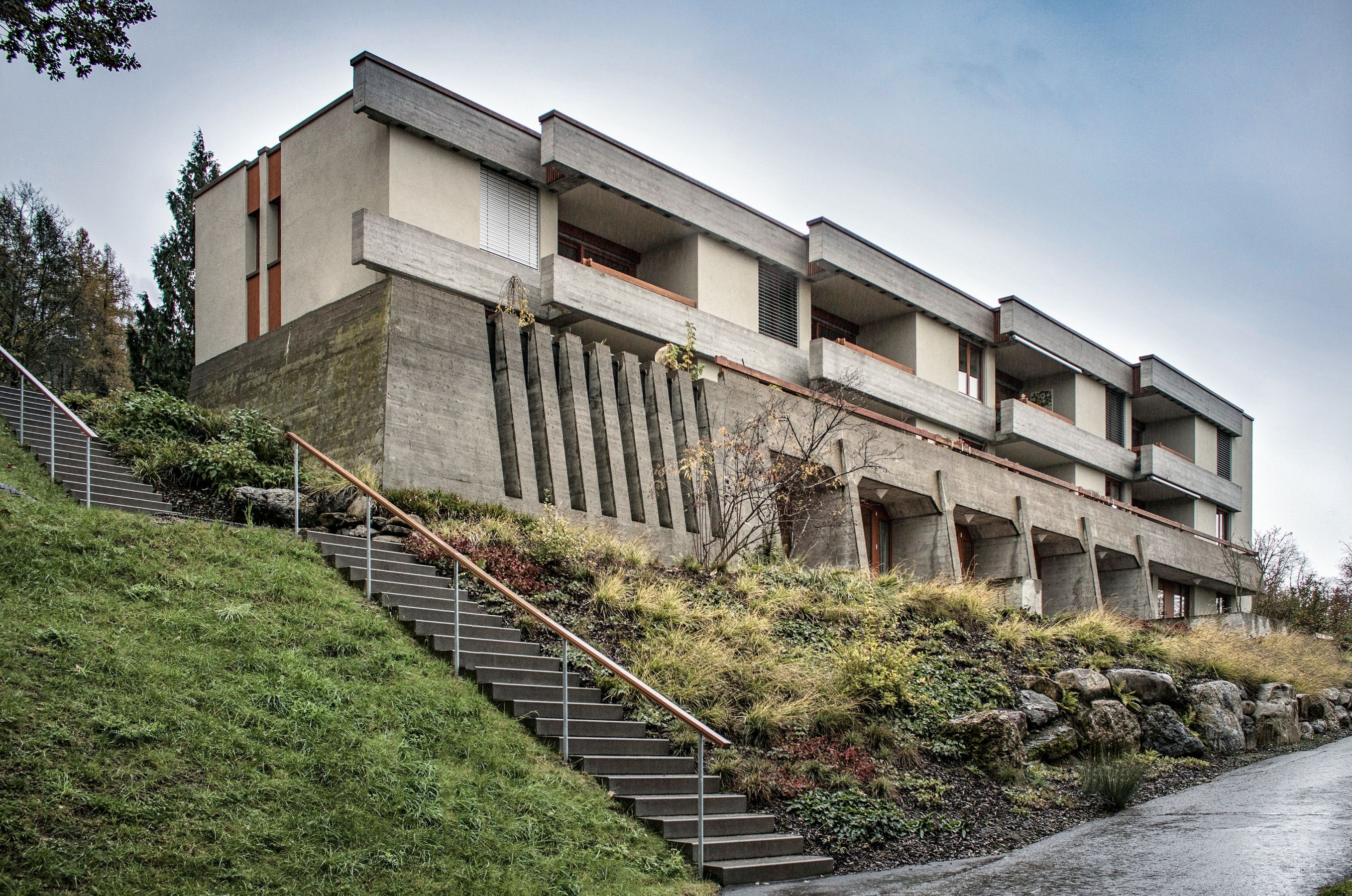 The brutalist building, constructed between 1968 and 1970, was designed by Zurich architect André Studer, who composed the complex according to the principles of “harmonic construction.” Landscape architect Josef Seleger created the perfect connection to nature.